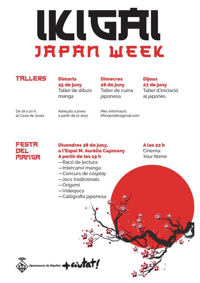 La Regidoria de Joventut i la Biblioteca Municipal han organitzat el cicle d'activitats 'Ikigai, Japan week', amb activitats adreçades a gent jove, del 25 al 28 de juny. Es tracta d'una iniciativa que vol promoure un espai cultural i d'oci per a joves vinculat a la cultura japonesa. "Ikigai" és un concepte japonès vinculat a la raó de viure, les coses importants a la vida, allò que ens fa aixecar al matí, el desig, l'amor i la felicitat. Aquesta és la segona edició d'una setmana temàtica per a joves, que l'any passat es va dedicar al món de Harry Potter.