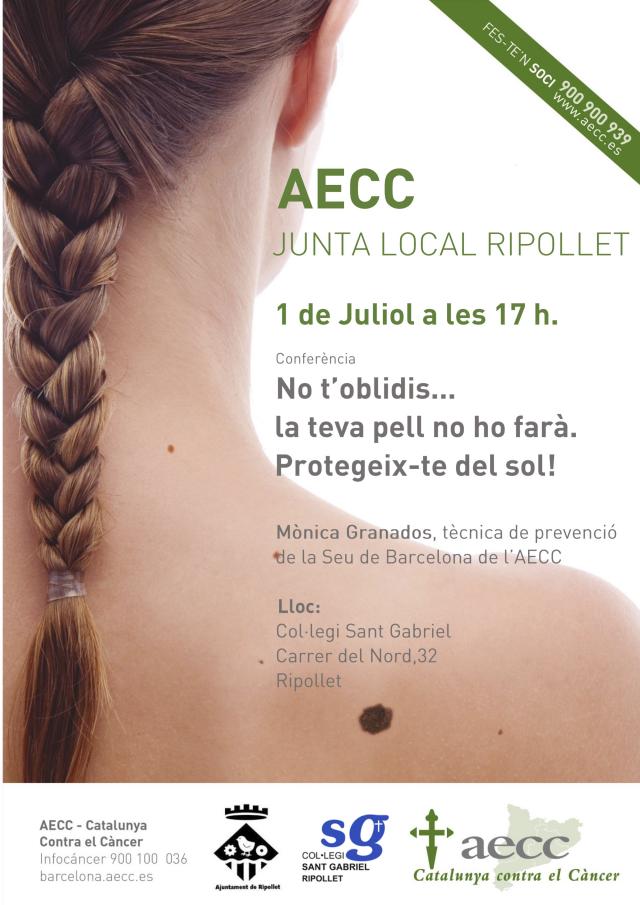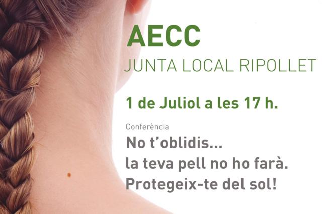 La junta local de l'Associació Espanyola Contra el Càncer (AECC) ha organitzat una conferència el proper dilluns, 1 de juliol, a les 17h sobre el càncer de pell i com prevenir-lo, a l'Escola Sant Gabriel de Ripollet. L'encarregada d'impartir-la serà Mònica Granados, tècnica de prevenció de la Seu de Barcelona de l'AECC per informar i conscienciar les veïnes i veïns de Ripollet.
