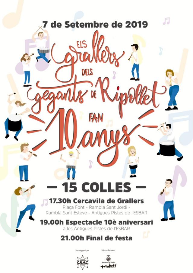 Aquest dissabte, 7 de setembre, a la tarda, Ripollet s'omplirà de música i cultura popular per celebrar el 10è aniversari dels Grallers dels Gegants de Ripollet, amb la 2a edició de la Trobada de Grallers que organitzen de forma quinquennal. En la trobada, hi participaran 10 colles de grallers provinents del Vallès Occidental, Vallès Oriental, Barcelonès, Baix Llobregat, Tarragonès i La Selva. També s'hi sumaran cinc entitats ripolletenques.