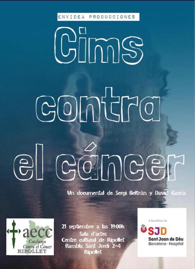 Aquest dissabte 21 de setembre s'estrenarà al Centre Cultural el documental Cims contra el càncer, sobre el projecte solidari homònim, que pretén recollir fons per lluitar contra el càncer. El documental, obra del ripolletenc David García i Sergi Beltran, d'Envidea Producciones, explica la història d'Alberto Gómez, supervivent d'un càncer a la glàndula paròtida, que després de superar la malaltia va decidir engegar amb els seus amics Vanessa i Roberto el seu propi projecte per ajudar els que la pateixen.