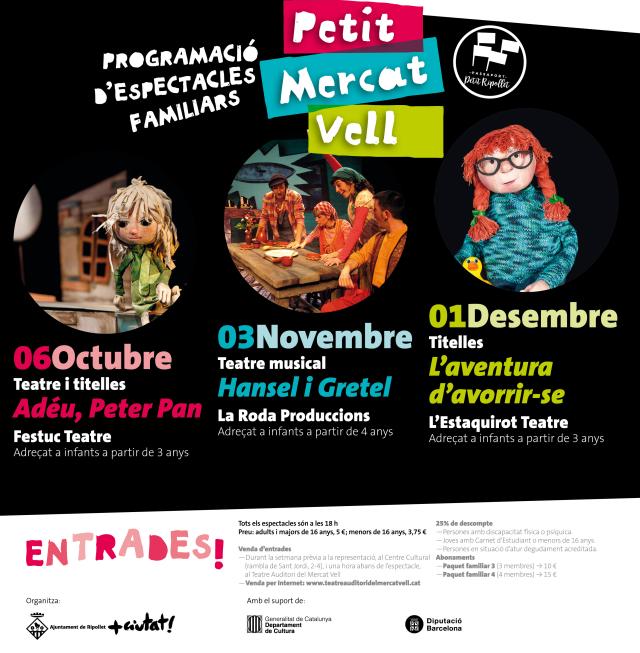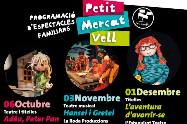 L'Ajuntament comença el pròxim diumenge, 6 d'octubre, la programació d'espectacles familiars al Teatre Auditori del Mercat Vell. Es tracta del Petit Mercat Vell, un programa que porta espectacles per a públic familiar tots els primers diumenges de mes, d'octubre a maig, i converteix el Teatre Auditori en un punt de trobada per a famílies i infants que gaudeixen amb les arts escèniques. El tret de sortida serà el pròxim 6 d'octubre amb un dels fenòmens de la temporada passada, 'Adéu Peter Pan' de Festuc Teatre.
