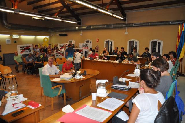 Entre el públic hi havia un grup de membres del CDR de Ripollet, convocats per protestar contra la moció sobre la neutralitat del consistori i les dependències municipals, que van exhibir pancartes amb el missatge "Llibertat presos polítics" i llaços grocs.