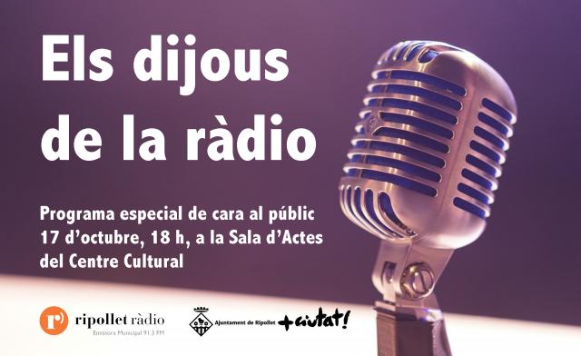 Aquest dijous, 17 d'octubre, Ripollet Ràdio ha organitzat el primer dels programes especials que, com a novetat, l'emissora municipal posa en marxa aquesta temporada. Es tracta d'Els dijous de la ràdio, un magazín informatiu que es realitzarà cada tercer dijous de mes, de 18 a 20 hores, de cara al públic i amb micro obert als assistents. En aquesta primera edició, que tindrà lloc a la Sala d'Actes del Centre Cultural, s'entrevistarà a l'ANC per valorar la sentència del procés i les mobilitzacions; seguit del coreògraf Juan López, que diumenge estrena el seu espectacle Danzas i a representants de la Comunitat Baha'i de Ripollet i Cerdanyola, la segona religió independent més important del món, que fa més de dues dècades que és present a Ripollet.