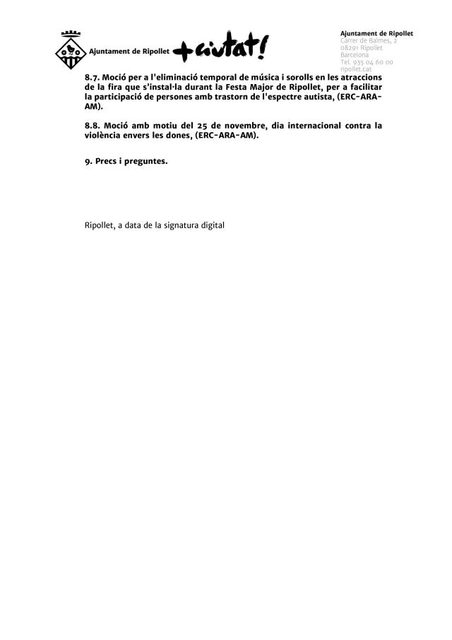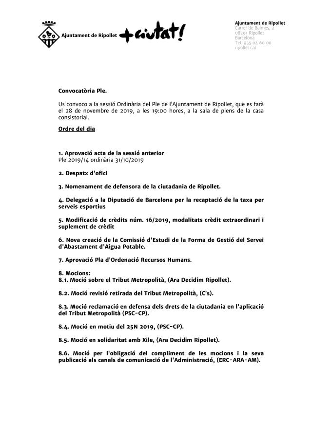 El punt de mocions compta amb 8 propostes, tres de les quals fan referència al Tribut Metropolità, presentades pels grups Ara Decidim Ripollet, C's i PSC-CP. N'hi ha dues en suport al 25N (d'ERC i el PSC), una en solidaritat amb Xile (de Decidim), una altra per l'obligació del compliment de les mocions (presentada per ERC) i una darrera per a l'eliminació temporal de música i sorolls a la fira per facilitar la participació de les persones amb transtorn de l'espectre autista.