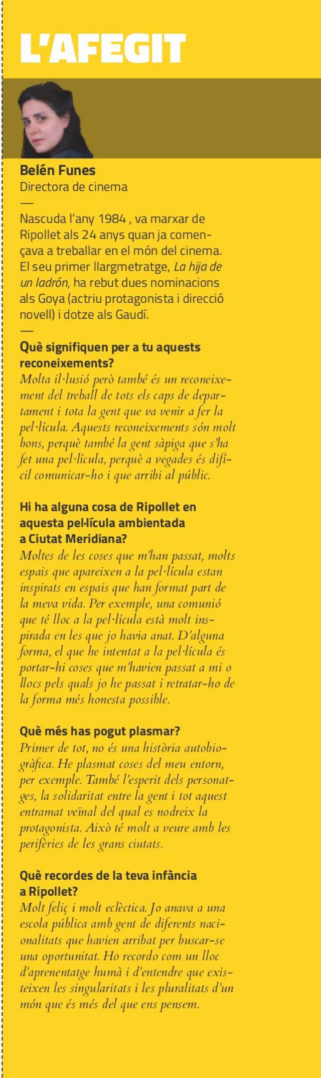 La ripolletenca Belén Funes també està nominada als Goya, en categoria de millor directora novell. La seva pel·lícula ha rebut una segona nominació, per a Greta Fernández com a millor actriu protagonista femenina. Podeu llegir una entrevista a Belén Funes al darrer número de la revista InfoRipollet.
