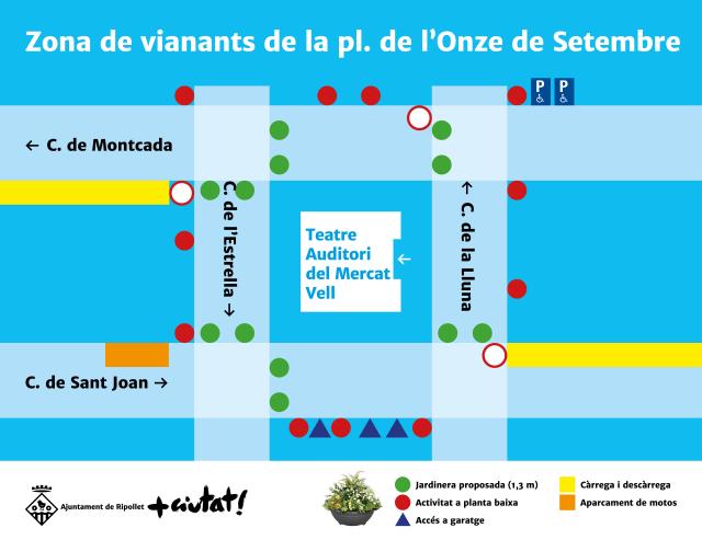 Aquesta transformació és una de les actuacions recollides en el Pla de mobilitat i pacificació de la zona centre, aprovat l'any 2018, i un exemple de la priorització d'aquelles polítiques i projectes que posen les persones al centre. El passat 20 de febrer, el govern municipal va convocar una reunió amb veïns i comerciants de la zona per tal d'explicar el projecte. A la trobada, que va tenir lloc a l'espai Domènec Torras del Teatre Auditori del Mercat Vell, l'acollida per part dels veïns va ser positiva, segons el mateix regidor, mentre que els comerciants van mostrar cert neguit davant aquest canvi. El govern, que ha recollit algunes de les aportacions realitzades durant la reunió, com ara habilitar places d'aparcament per a motos, ha adoptat el compromís d'informar amb més temps les futures actuacions de pacificació per tal de poder respondre a les diferents sensibilitats. A la plaça de l'Onze de Setembre també s'habilitaran noves zones de càrrega i descàrrega i noves places per a persones amb diversitat funcional. A més, tant el regidor de Mobilitat i Via Pública, Fran Sánchez, com la regidora de Comerç, Txell Caler, han acordat fer un seguiment i reunions periòdiques amb els comerciants.