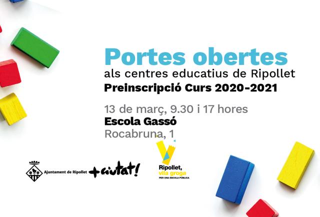 AJORNADES Aquest divendres hi ha portes obertes a l'escola Gassó i Vidal. L'hora de recepció de les famílies és a les 9.30 i 17 hores. La setmana vinent serà el torn de l'Escursell, l'institut Can Mas, l'institut escola Els Pinetons, l'escola Ginesta, l'institut Palau Ausit i l'escola Clavé. Cada jornada publicarem informació dels centres que facin portes obertes. Trobareu més info a la secció de Preinscripció, relacionada a sota.
