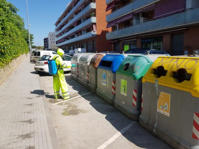 Pel que fa a les tasques de desinfecció, aquestes han restat reduïdes, amb un operari amb motxilla que realitza, de dilluns a divendres, la desinfecció d'espais públics concrets, com ara els CAP, el Mercat Municipal, la Comissaria dels Mossos d'Esquadra i de Policia Local. La resta de la jornada, desinfecta mobiliari urbà (contenidors, papereres, bancs, parades de bus i baranes), amb una freqüència de tot el mobiliari urbà de Ripollet d'un cop a la setmana.