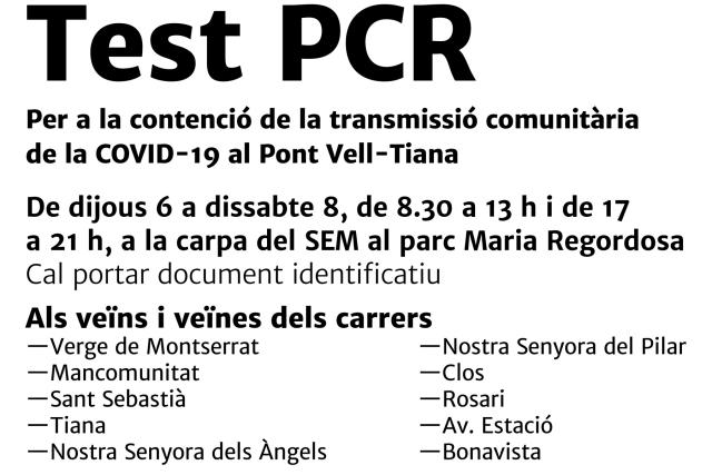 Així, a partir de dimecres, el personal sanitari visitarà cada domicili dels blocs on s'ha detectat una incidència major per tal de fer un test PCR a totes les persones que hi viuen. També dimecres quedarà instal·lada una carpa del SEM al parc Maria Regordosa, per tal que totes les persones dels barris de Pont Vell i Tiana puguin acostar-se a fer-se aquest test.