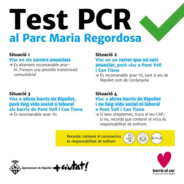 A la imatge adjunta podeu trobar les quatre situacions possibles i com actuar davant les proves PCR que s'ofereixen: si sou veïns dels carrers anunciats és altament recomanable fer la prova, si sou veïns del barri però no dels carrers és recomanable anar-hi tant si sou de Ripollet com de Cerdanyola, si sou ripolletencs d'altres barris però que feu vida social o laboral a Pont Vell i Can Tiana també convé fer-lo i, en qualsevol altre supòsit, es recomana trucar al CAP de referència en cas de tenir símptomes i seguir amb les mesures de prevenció de distància, higiene de mans i mascareta. També s'adjunta un pdf amb preguntes freqüents sobre les proves PCR.