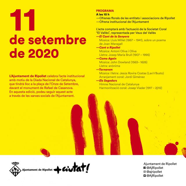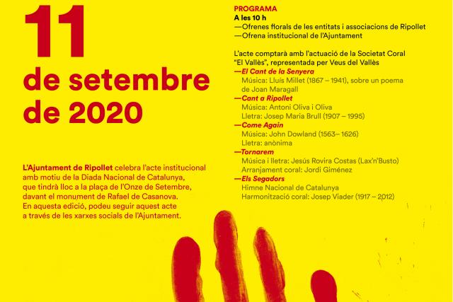 L'acte institucional de la Diada Nacional de Catalunya a Ripollet tindrà lloc aquest divendres, a les 10 hores, a la plaça de l'Onze de setembre, davant el monument a Rafael Casanova. De manera excepcional, tindrà l'aforament reduït, limitat als representats que facin les ofrenes florals, segons les mesures de prevenció de la COVI-19. Tampoc hi haurà parlaments ni les tradicionals actuacions d'entitats. Més d'una desena d'entitats han confirmat la seva participació. L'acte estarà amenitzat per la Coral Veus del Vallès de la Societat Coral "El Vallès", que actuarà també segons el protocol sanitari previst. A causa de la situació extraordinària i la impossibilitat de donar acte accés lliure al públic, la diada es podrà seguir en directe a través de del canal de Facebook de l'Ajuntament de Ripollet.