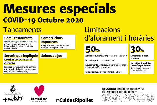 Entre les restriccions establertes, des d'avui divendres i, com a mínim, fins al 30 d'octubre, destaca el tancament de bars i restaurants, que a partir d'avui només poden servir begudes o menjar a domicili o per recollir a l'establiment amb cita prèvia; la reducció al 50% de la capacitat d'espais per a activitats culturals, que han de tancar a les 23 h; d'activitats esportives i gimnasos, i la limitació de l'aforament del comerç minorista i mercats setmanals al 30%. L'objectiu d'aquestes mesures és frenar l'alt increment de casos positius de COVID-19 de les darreres setmanes, amb xifres de contagi molt preocupants.