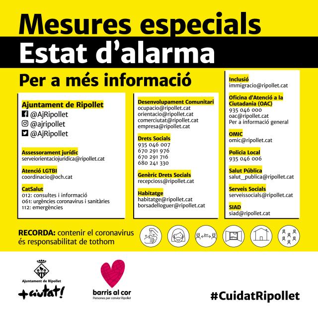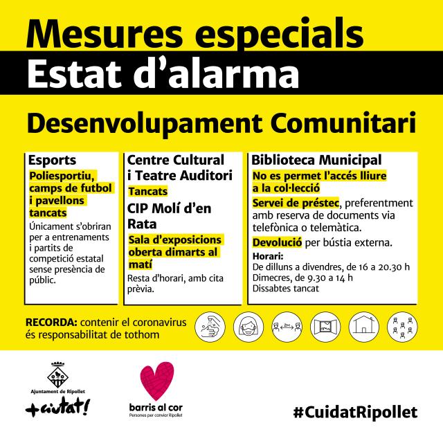 Les noves mesures també han comportat el tancament d'instal·lacions i la suspensió d'activitats. Així, a Ripollet s'han hagut de tancar el Poliesportiu, els camps de futbol i els pavellons, així com el Centre Cultural i el Teatre Auditori. La Biblioteca manté el servei de préstec, preferentment amb reserva de documents, i la devolució per bústia externa.