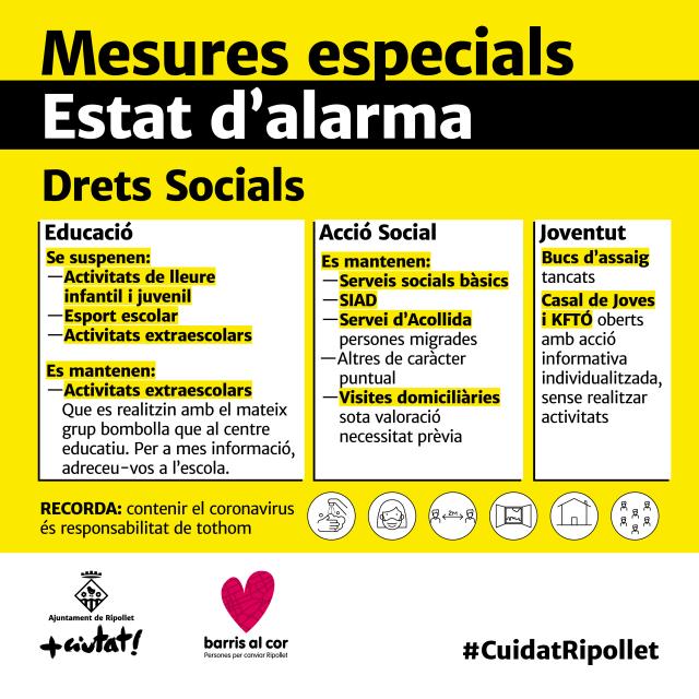 En l'àmbit de Drets Socials, es mantenen bona part dels serveis d'acció social, mentre que s'han suspès les activitats grupals del Casal de Joves, les activitats de lleure, d'esport escolar i les activitats extraescolars fora del grup bombolla. També han tancat els bucs d'assaig.