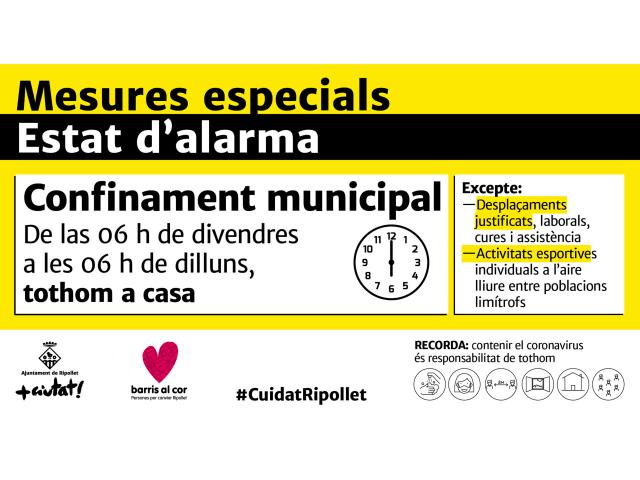 Des del 30 d'octubre, en aplicació de la resolució SLT/2700/2020, de 29 d'octubre per la qual es prorroguen i es modifiquen les mesures en matèria de salut pública per a la contenció del brot epidèmic de la pandèmia de COVID-19 al territori de Catalunya, divendres a les 6 h va iniciar-se un confinament municipal, que ha finalitzat avui dilluns a les 6 del matí. Tot i coincidir amb la celebració de la castanyada i Tots Sants, el cap de setmana ha estat tranquil, segons fonts de la Policia Local, que va reforçar la vigilància a espais públics i les entrades i sortides del municipi. Les mesures també han afectat alguns equipaments culturals i esportius, que han hagut de tancar o restringir els seus serveis.