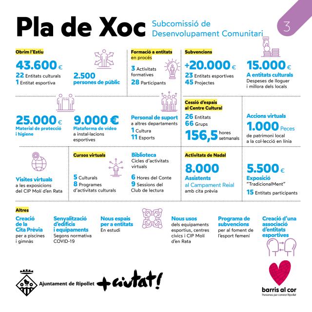 Per poder implementar el Pla de Xoc, es va haver d'aprovar una modificació de crèdits per valor de 300.000 euros, 100.000 € per cada subcomissió. Entre les mesures més urgents, hi era la de fer front a les necessitats bàsiques de la ciutadania, motiu pel qual Drets Socials va ampliar aquesta partida en 62.000 euros, així com la de beques, en més de 10.000 €. En el si d'aquesta subcomissió, també es va acordar el naixement de la Coordinadora Ciutadana de Drets Socials, que recentment ha endegat una campanya permanent de recollida d'aliments, per tal de donar suport a les entitats socials locals. L'atenció a la gent gran també ha estat una prioritat en aquesta taula sectorial, mantenint el servei i oferint una comunicació constant a unes 4.000 persones grans del municipi, així com organitzant activitats entre els mesos de juliol a octubre. L'atenció a les persones joves i el suport als centres educatius han estat altres línies de treball del Pla.