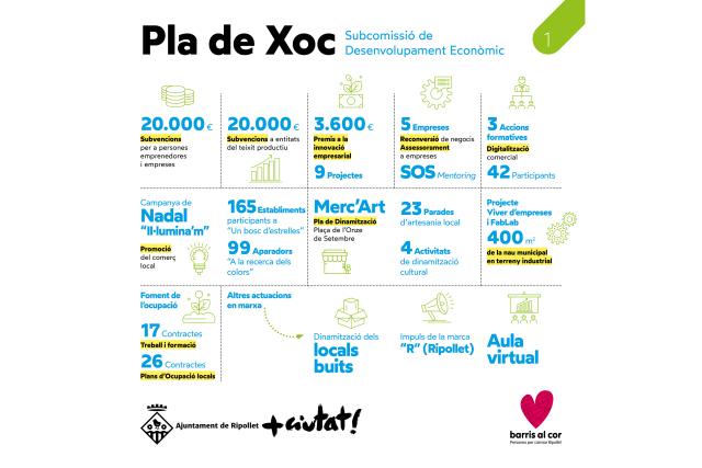 Per últim, les accions del Pla de Xoc acordades a la subcomissió de Desenvolupament Econòmic han estat destinades al suport, la dinamització i la promoció del teixit productiu, comercial i industrial del municipi, així com al foment de l'ocupació. En aquest sentit, l'alcalde ha explicat que la majoria d'ajudes es van aprovar al juliol i s'han publicat entre l'octubre i novembre, valorant aquest procés com a "satisfactori, tot i les qüestions jurídiques i administratives que com a Ajuntament hem hagut de tenir en compte".
