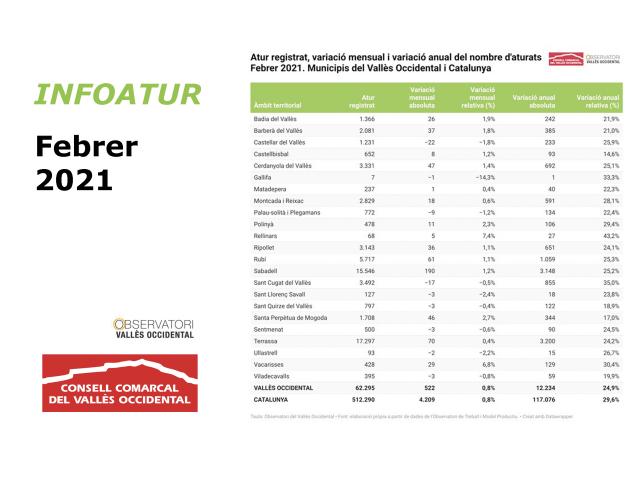 Des d'inici d'any, el Consell Comarcal no facilita les taxes d'atur registral per municipi, argumentant que s'està treballant en un nou model de càlcul. La dada que sí que es publica és la variació interanual, on es veu reflectit l'efecte de la COVID-19. A Ripollet l'atur interanual ha crescut en 651 persones respecte el final de febrer de 2020, un augment del 24,1%, inferior al 24,9% comarcal i el 29,6% català.