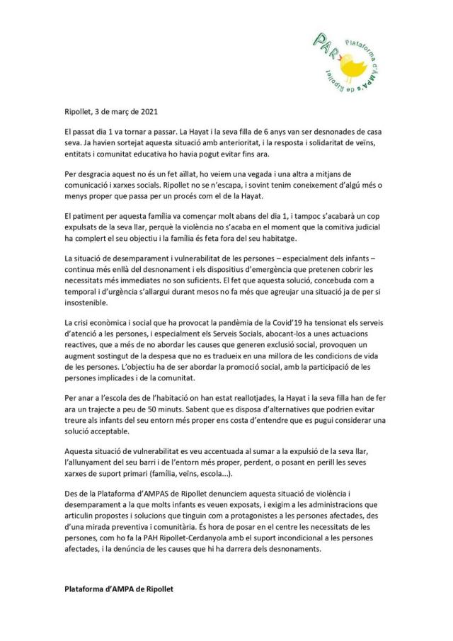 La Plataforma d'AMPA de Ripollet i l'AFI El Martinet han emès un comunicat, difós a través de les seves xarxes socials, en què es denuncia el desnonament que es va executar dilluns a Ripollet, quan es va fer fora de casa seva la Hayat i la seva filla de 6 anys, alumna de l'escola El Martinet. Al text denuncien que "la situació de desemparament i vulnerabilitat de les persones -especialment els infants- continua més enllà del desnonament i els dispositius d'emergència que pretenen cobrir les necessitats més immediates no són suficients". Afegeixen que "el fet que aquesta solució, concebuda com a temporal i d'urgència, s'allargui durant mesos no fa més que agreujar una situació ja de per si insostenible".
