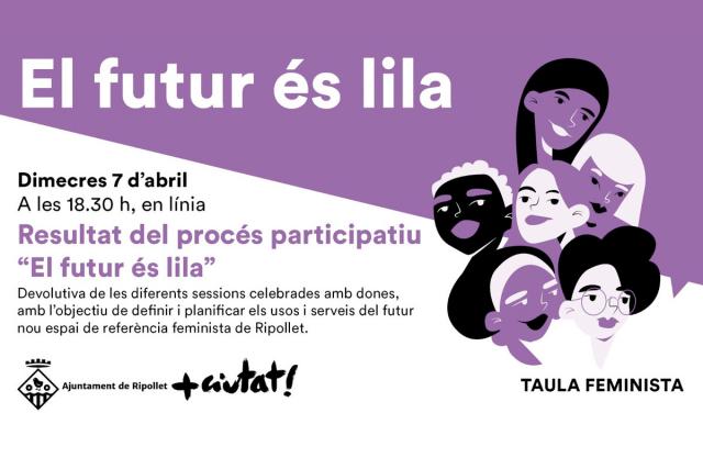 Aquest dimecres, dia 7, a les 18.30 h, es presenta el resultat del procés participatiu "El futur és lila", per definir els usos del nou espai de referència feminista a Ripollet, que s'ubicarà a les dependències de l'antic Jutjat de Pau, al carrer Nou número 21. El procés va constar d'unes enquestes al portal de participació del web de l'Ajuntament, a més de dues sessions obertes tant a ciutadania com a entitats.