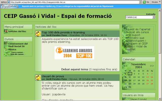 La propera setmana es faran públics els finalistes dels premis eLearning 2004, atorgats per l’entitat ‘European Schoolnet’, als quals opta el CEIP Gassó i Vidal de Ripollet. El centre va presentar al setembre els seus projectes de pàgina web, la televisió de l’escola i b-learning Medi Social i Cultural, havent estat seleccionat aquest darrer entre les 100 millors propostes, de les 1.021 que es van presentar. Aquest projecte consisteix en un curs en línia de Medi Social i Cultural, que tant els alumnes com persones externes al centre poden realitzar a través de l’espai de formació de la web de l’escola.