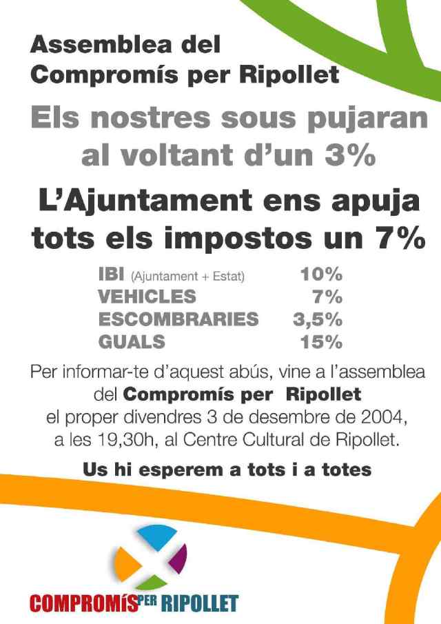 El Compromís per Ripollet ha posat en marxa una campanya contra la pujada dels impostos i taxes municipals al 2005. El principal partit de l’oposició es va reunir dimecres 17 de novembre amb representants de les entitats veïnals per donar a conèixer la seva postura contra el que considera un increment “desmesurat i abusiu” de les ordenances. Després d’aquesta trobada, el CpR ha convocat una assemblea, que se celebrarà el proper divendres 3 de desembre al vespre al Centre Cultural. La proposta del CpR va en la línia de demanar la supressió de la taxa d’escombraries, la congelació de l’IBI i la revisió del 3,5 % del l’impost de circulació i dels guals. En una convocatòria de premsa, aquest grup va criticar la manca de voluntat negociadora de l’equip de govern.