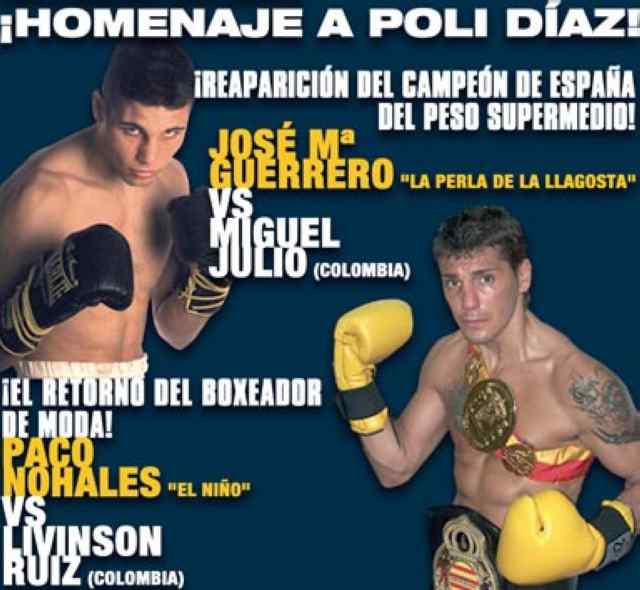 El Pavelló Municipal d’Esports acull aquesta nit una vetllada de boxa en homenatge a l’excampió d’Europa de pes lleuger, Poli Díaz. L’acte, organitzat per Rubén Solé i Gallego Prada, començarà a les 22 hores i comptarà amb sis combats on s’enfrontaran els millors boxejadors del moment, entre ells l’actual campió d’Espanya en pes super mig, José Maria Guerrero, que lluitarà a sis ‘rounds’ contra el rus Mamuka Khuhasvili. El Combat estel·lar serà, però, el que enfrontarà l’excampió d’Espanya del pes lleuger, Paco ‘El Niño’ Nohales, al colombià Livinson Ruiz, en un combat a 10 assalts.