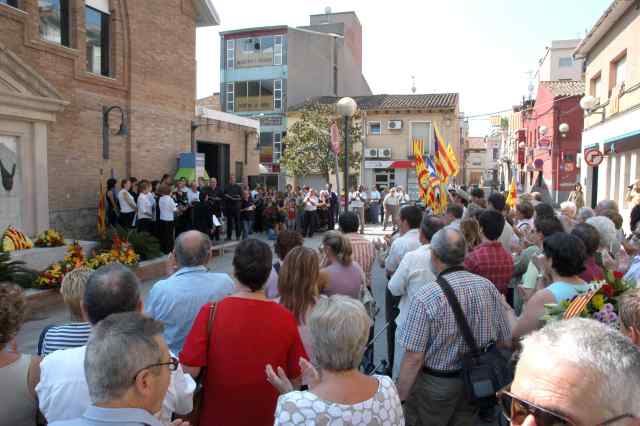 Desenes de persones van assistir a l'acte institucional de celebració de la Diada Nacional de Catalunya, davant el monument de Rafael Casanova, a la plaça 11 de Setembre. Un total de 15 entitats i partits polítics van realitzar ofrenes florals, amenitzades per la Societat Coral El Vallès. En el moment de l'ofrena consistorial, només van comparèixer els regidors de l'equip de govern, ja que l'oposició no voler posar per a la foto oficial, com a mostra de protesta davant el tripartit local.