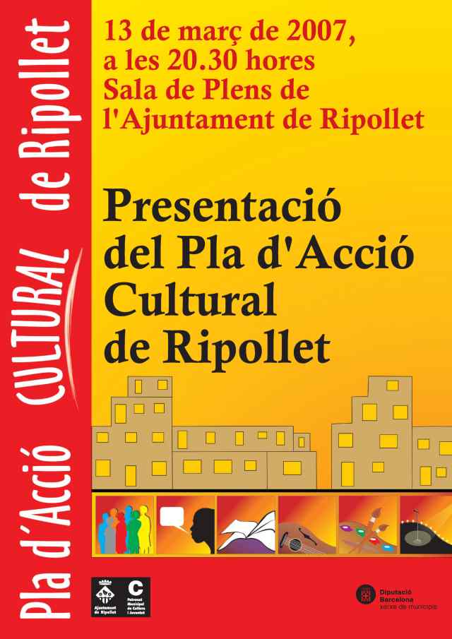 El proper 13 de març, a dos quarts de nou del vespre, a la Sala de Plens de l'Ajuntament de Ripollet es farà la presentació del document definitiu del Pla d'Acció Cultural de la nostra vila. L'objectiu del text ha estat fer un diagnòstic de la realitat cultural de la ciutat així com detectar les necessitats i demandes dels agents culturals.