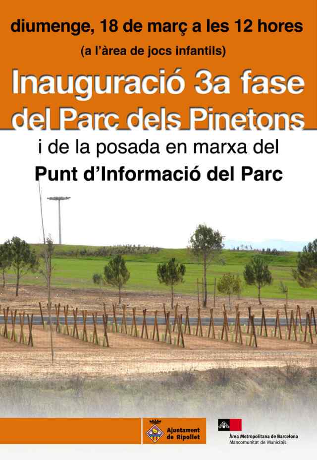 El proper diumenge, 18 de març, s'obrirà al públic la tercera fase de la urbanització del parc metropolità dels Pinetons, amb una extensió de 3,7 hectàrees. Coincidint amb aquest acte, s'inaugurarà el Punt d'informació del parc. Amb aquestes activitats s'inicia l'Agenda de Primavera de la Casa Natura, organitzada per la Regidoria de Medi Ambient de l'Ajuntament de Ripollet.L'obra, realitzada per l'AMB, ha tingut un cost de més d'un milió d'euros.
