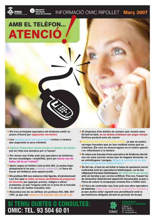 Llegir amb atenció el contracte del telèfon i les condicions que ens proposa la companyia, evitar fer trucades a números d'alt cost i prefixos 806 o 905 i controlar les trucades que apareixen reflectides a la factura són alguns dels consells que proposa la campanya. També s'ha editat un cartell per divulgar la informació on es pot trobar el telèfon i adreça de la OMIC perquè tots aquells ciutadans i ciutadanes que vulguin s'hi puguin dirigir per realitzar les seves consultes sobre aquest i altres temes.