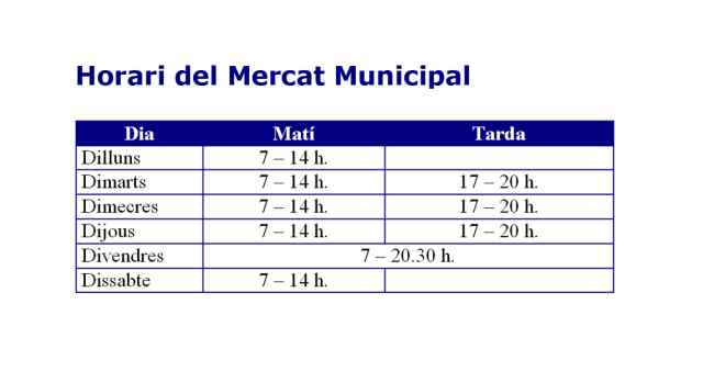 Durant aquest mes d'agost alguns dels paradistes del Mercat Municipal han obert les tardes de dimarts a dijous, a banda de l'horari habitual, tal i com van decidir en una reunió de la Junta de Concessionaris del Mercat abans de l'estiu. De moment, aquesta iniciativa és opcional i s'ha decidit aplicar per tal d'adaptar-se a les noves demandes dels clients, especialment després de l'obertura del supermercat Mercadona.