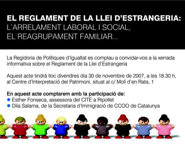 La Regidoria de Polítiques d'Igualtat ha organitzat per aquest divendres, 30 de novembre, una xerrada sobre la Llei d'estrangeria l'arrelament laboral i social, el reagrupament familiar. L'acte tindrà lloc a dos quarts de set de la tarda, al Centre d'Interpretació del Patrimoni.