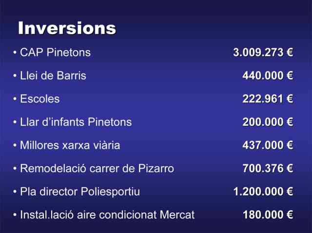 A l'apartat d'inversions, l'equip de govern va destacar la construcció del CAP Pinetons, amb 3.009.273 euros i el primer any d'inversió de la Llei de Barris, amb 440.000 euros, que inclou uns 340.000 euros per a la construcció del Centre Cívic del barri i uns 100.00 euros per la redacció del projecte del parc de Primer de maig, que inclou un pàrquing. Quant a inversions a les escoles, es detinaran 222.961 euros a millores i s'incrementarà en 200.000 euros el pressupost fixat el 2007 per a la construcció de la Llar d'Infants del Pinetons. Així mateix, es crearà un partida nova per millores a carrers i parcs, de 473.000 euros, que es gestionarà des de la ponència de Vies Públiques. Una altra de les principals inversions, serà la remodelació del carrer de Pizarro, amb 700.376 euros. Enguany es destinarà 1,2 milions d'euros a la continuació del Pla director del Poliesportiu, per al cobriment de les piscines i la continuació del camp de l'Industrial. Finalment, s'instal·larà aire condicionat al Mercat Municipal, amb un cost de 180.000 euros.