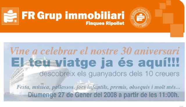 L'empresa local Finques Ripollet, fundada fa 30 anys per Jaume Mogas i Joan Albiñana, celebrarà aquest diumenge, 27 de gener, el seu aniversari amb una festa a la Rambla de Sant Jordi. L'acte començarà a les 11 del matí i comptarà amb l'actuació de pallassos, inflables, un globus aerostàtic i consumició gratuïtes. A més, Finques Ripollet sortejarà 10 creuers entre tots els seus clients de 2007.