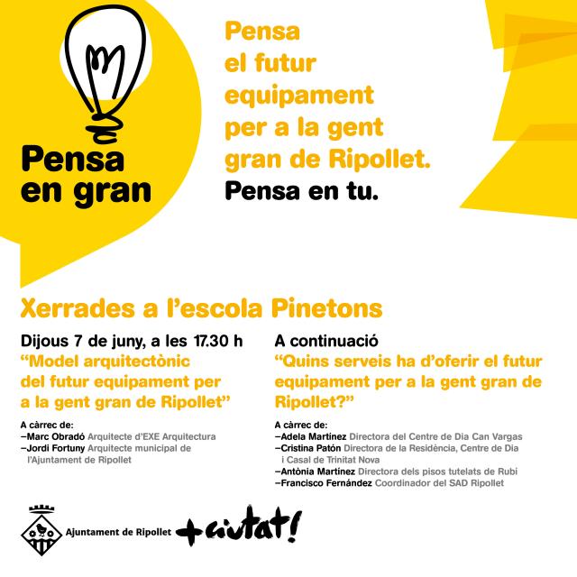 Continuant amb el procés participatiu "Pensa en gran", per tal d'obrir el debat i aportar idees per a la creació de propostes, s'oferiran dues xerrades el dijous, 7 de juny, a les 17.30 h, a l'escola Pinetons. Aquestes xerrades estan obertes a tot el públic.