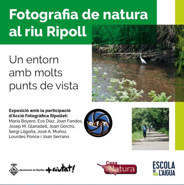 El riu Ripoll és el protagonista de dues mostres que es poden visitar des d'aquest dilluns, 9 de juliol, a la Casa Natura. Es tracta, d'una banda, de la mostra de fotografia de natura del riu Ripoll, amb imatges de nou fotògrafs de l'entitat Acció Fotogràfica Ripollet, i d'altra, de la mostra 'Ripollet som riu', de l'Ajuntament de Ripollet. Es poden visitar fins al 31 de juliol, de dilluns a divendres, de 10 a 13.30 h.