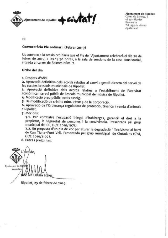 Pel que fa a les mocions, es portaran a votació la del Partit Popular contra l'ocupació d'habitatges (R/E 2019/1971) i la moció de Ciutadans sobre la seguretat i l'incivisme al barri de Can Tiana-Pont Vell.