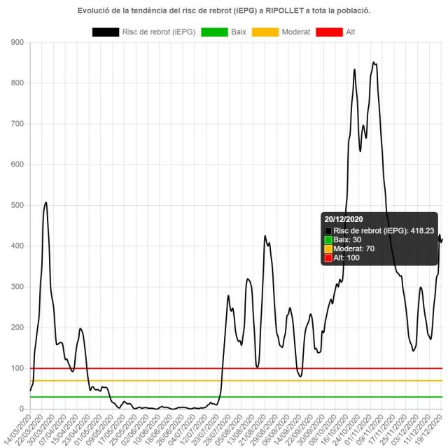El darrer informe de l'Agència de Salut Pública de Catalunya, amb data de 18 de desembre, ja alertava d'un increment de casos, destacant una incidència molt alta en el grup de 15 a 24 anys, tot i que el grup amb major incidència és el de més de 65 anys. El risc de rebrot que el dia 18 havia pujat a Ripollet fins a 165,5, hores d'ara, segons el web dadescovid de Salut, se situa en un valor de 418, el doble que la setmana anterior. Del 14 al 20 de desembre s'han detectat a Ripollet 61 casos positius de COVID-19, amb una taxa d'incidència de 158,33 casos per cada 100.000 habitants. Davant d'aquesta situació, l'alcalde de Ripollet, Jose M. Osuna assegura que "tot i ser conscients de la importància de retrobar-nos amb familiars i amics durant les festes de Nadal, enguany ha de ser diferent, quedant-nos a casa, si volem deixar enrere la COVID-19 durant l'any 2021".